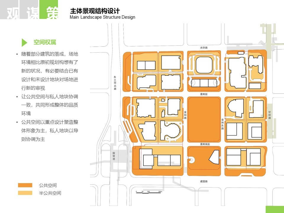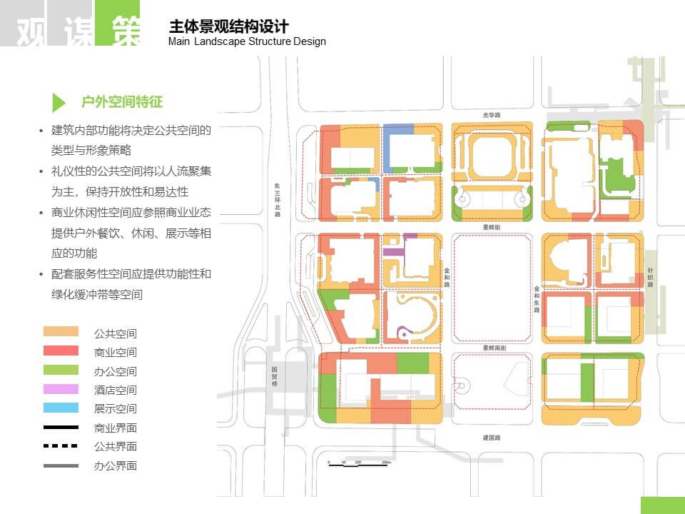 策划提出策略性的空间框架、文化诉求、色彩体系、设施布局等控制性要求、引导该区域公共空间及商业地块,为建筑物与街景注入活力,打造舒适、有趣、富有活力、令人难忘的场所。该策划作为统筹和指导区域交通、景观、设施及商业规划与设计的上位规划,并且在北京CBD 核心区得以开展尚属于国内首例。通过公共艺术的整体策划为CBD 核心区创造高品质的公共空间,并且让它作为全球经济高地的同时也成为一个文化艺术的目的地。该策划将作为区域规范性文件得以长效执行,北京央美城市公共艺术院(CAPA)也作为顾问单位提供长期的跟踪服务。