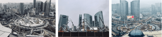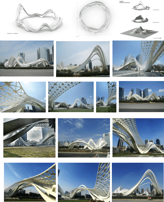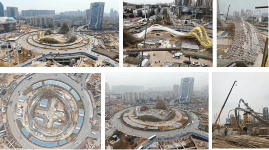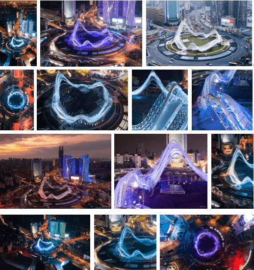 直径90米的跨度与40米的挑高保证了其在空间中所应呈现的体量。雕塑主体富有韵律的起伏造型象征武汉山水交融的城市地貌,3条显现而充满张力的曲线对应雄峙鼎立的武汉三镇,俯瞰近似玉璧的环形形态是对未来美好生活的向往,线条交织所编织出迈向未来的梦想也将在深夜的星空点亮。