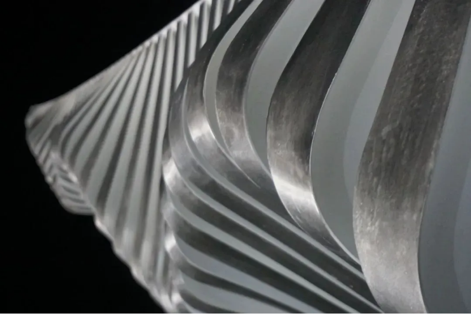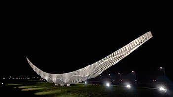 作品以弦月与山水流动的意象为灵感,呈现了空中流溢的“一抹银白色玉带”景象。其简洁的曲面伴随着流动的肌理,宛如“一轮弯月挂空”,展现出城市的雄伟与魅力。