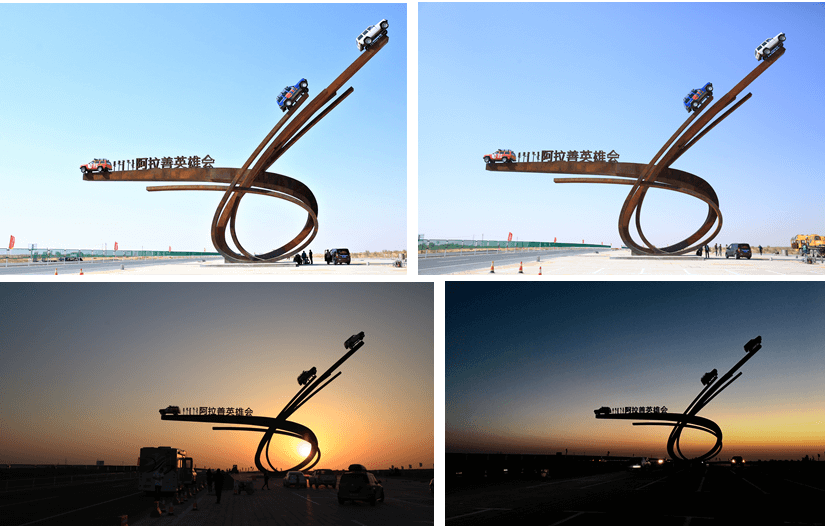 作品《越野千里》位于通往英雄会会场的必经之路上,弯曲交错的钢铁线条既是汽车冲向蓝天的轨迹,又是韧性和力量相互辉映的越野精神。
