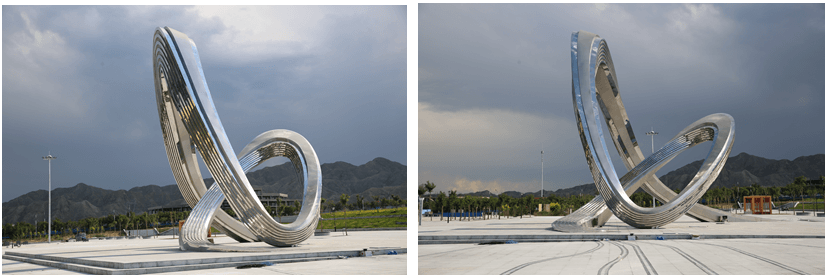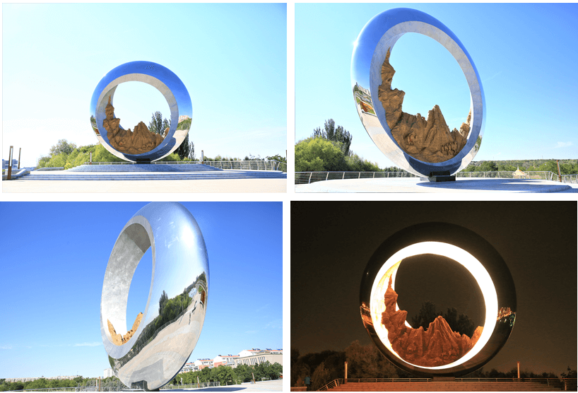 作品《丝路驼乡》位于巴彦浩特镇锡林街和雅布赖街交叉路口,圆环象征着东西方文明的交汇与融合,中部环衬以骆驼及群山。骆驼是阿拉善的象征,地毯是阿拉善的名物,驼背载着地毯,越过群山,将阿拉善的美名传向世界。