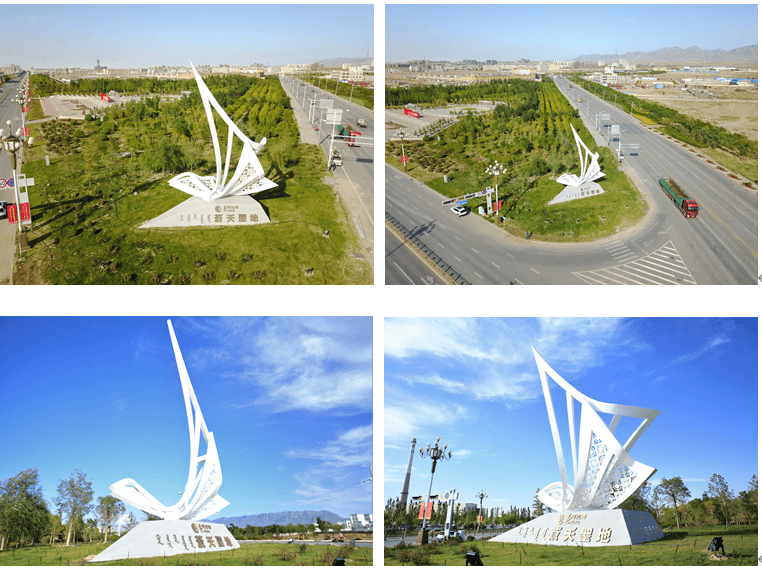 《地毯之城》位于巴彦浩特镇银巴高速公路路口。设计选取阿拉善特色毛毯及阿拉善地区和蒙古族传统的纹样图案为元素,空间中“飘荡摇曳”的线性构筑,宛如城市里舞动的飞毯,其造型轻盈、构思巧妙,以视觉语言诠释出阿拉善“地毯之城”的美誉。