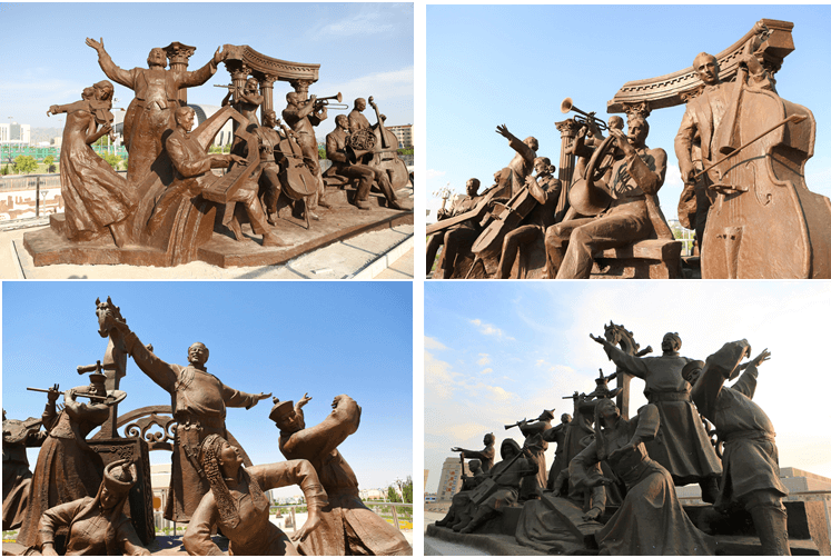作品《长调交响》位于巴彦浩特镇金色胡杨音乐厅门口,两组雕塑中分别表现了西方和蒙古音乐中--弹、拉、吹、唱的音乐表现形式。两边的音乐人各自沉醉在音乐中,又交相辉映,表达出交流、融合的国际视野。