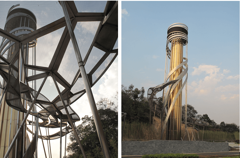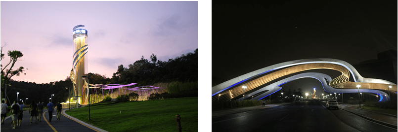 钟楼作为天湖公园的最高点,是龙舟文化的精神象征,我们以龙头为意象,指引着龙舟的方向。钟楼以龙柱为意象,楼体大量运用LED等现代手法,突出夜间灯光效果,极力打造艺术品夜间效果,成为体育公园的标志。