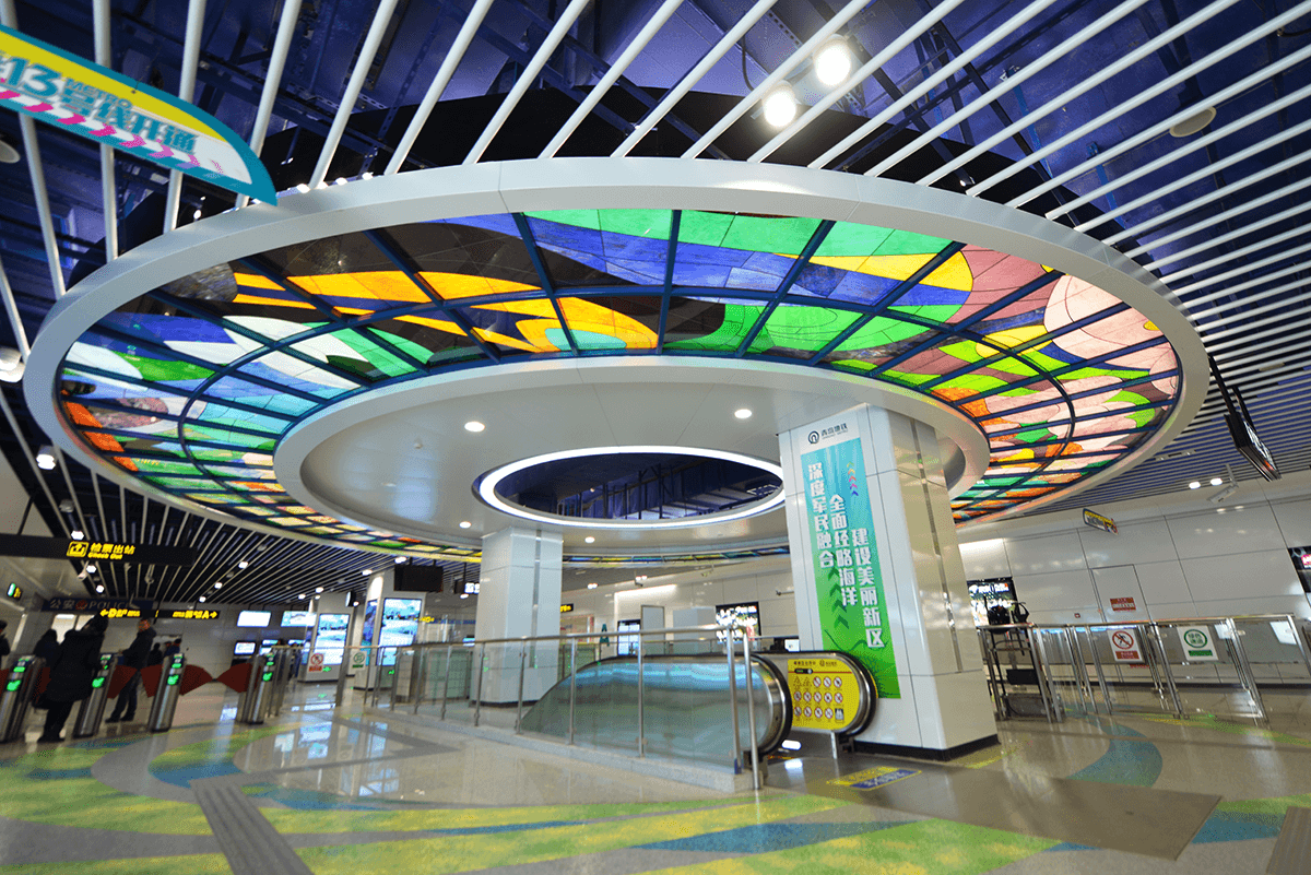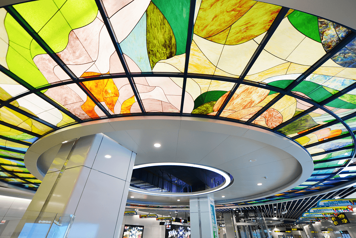 整体空间的色彩渐变以及彩色玻璃的运用,共同创造出一个色彩晕染的立体空间。乘客置身其中,仿佛被五彩斑斓的梦境包围,这也正是设计者的初衷—在丰富绚丽的的空间中,衍生出奇妙的人、空间、艺术的互动关系。