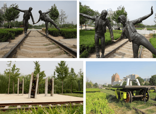 尤其是其中以一对青年男女牵手嬉戏于废 弃的具有百年历史的铁路轨道之上的雕塑,以及篆刻于枕木之上的诗文及城 市故事 ...