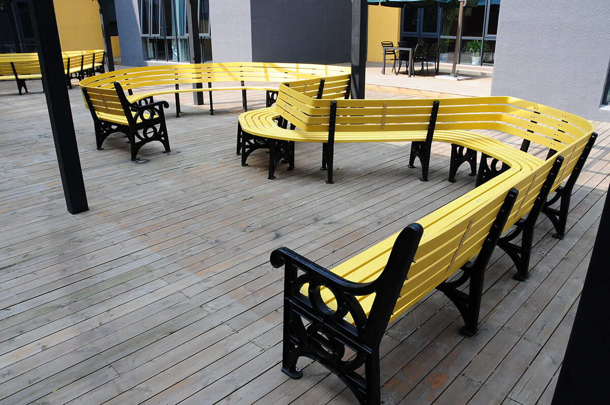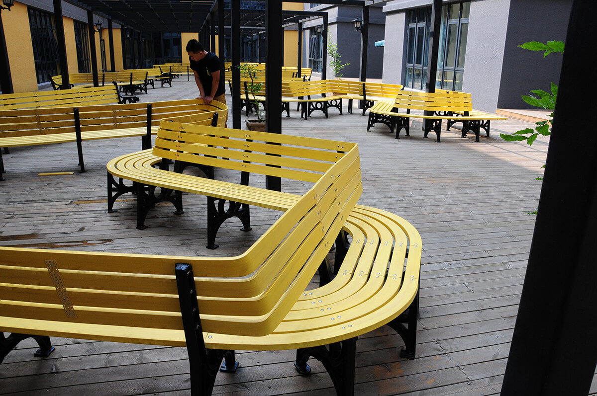 座椅的椅子腿是沿用老校区的长椅,来增加作品的亲近感,同时也是对于老校区的纪念和传承,通过塑木的材料进行整体磨具定做来实现双曲线的靠背造型,最大程度为大家营造一个舒适的交流场所。