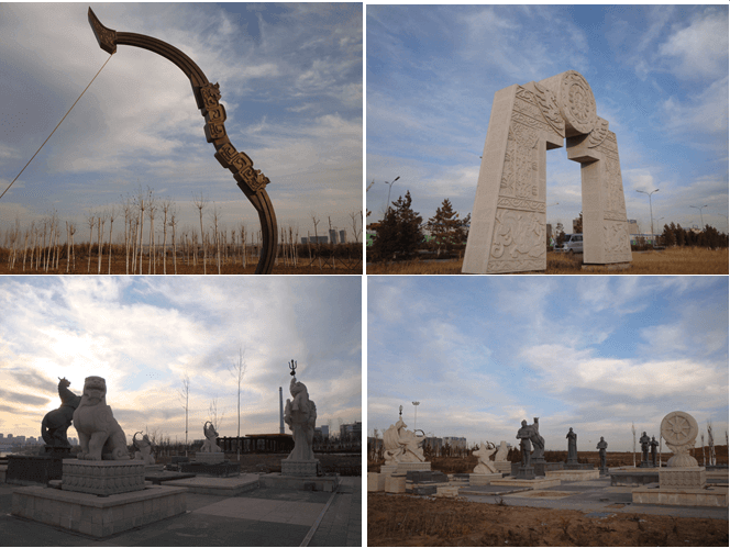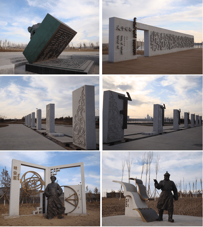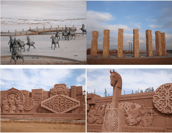 文傲风月:直立的蒙古文字,傲然地展示着蒙古人挺立的性格,园区使用当代艺术语言中用基本元素重组景观的先进手法。