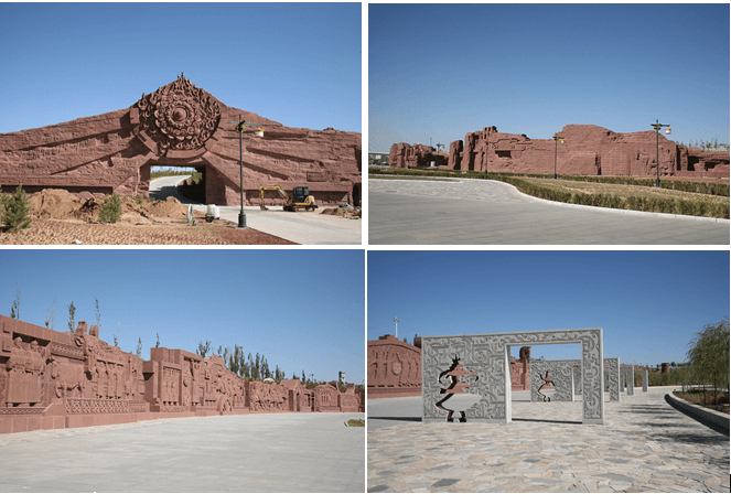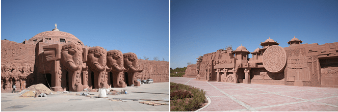 佛光云影——鄂尔多斯婚礼:此片区域讲述的是鄂尔多斯婚礼的故事。哈达定亲 - 配弓娶亲 - 拦门迎婿 - 献羊祝酒 - 求庚问名 - 卸羊脖子 - 分发出嫁 - 母亲祝福 - 抢帽子 - 圣火洗礼 - 跪拜公婆 - 掀开面纱 - 新娘敬茶 - 大小回门等婚礼情节有机的演绎于石窟之上。阿尔寨石窟的视觉意向流淌全园,与乌兰木伦河并行相望,以恢宏统一的造型语言形成独树一帜的园区视觉符号,融汇地景、建筑、雕塑、浮雕、壁画,全方位演绎展现蒙元文化精神瑰宝。此片区域描绘的是那达慕大会的故事。